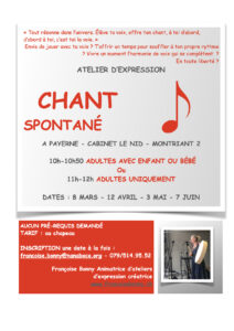 L’occasion d’apprendre les bases d’un mode d’expression artistique, de se faire du bien, explorer et développer son ressenti et son expression par la voix et le corps, de laisser émerger ce qui veut se dire.